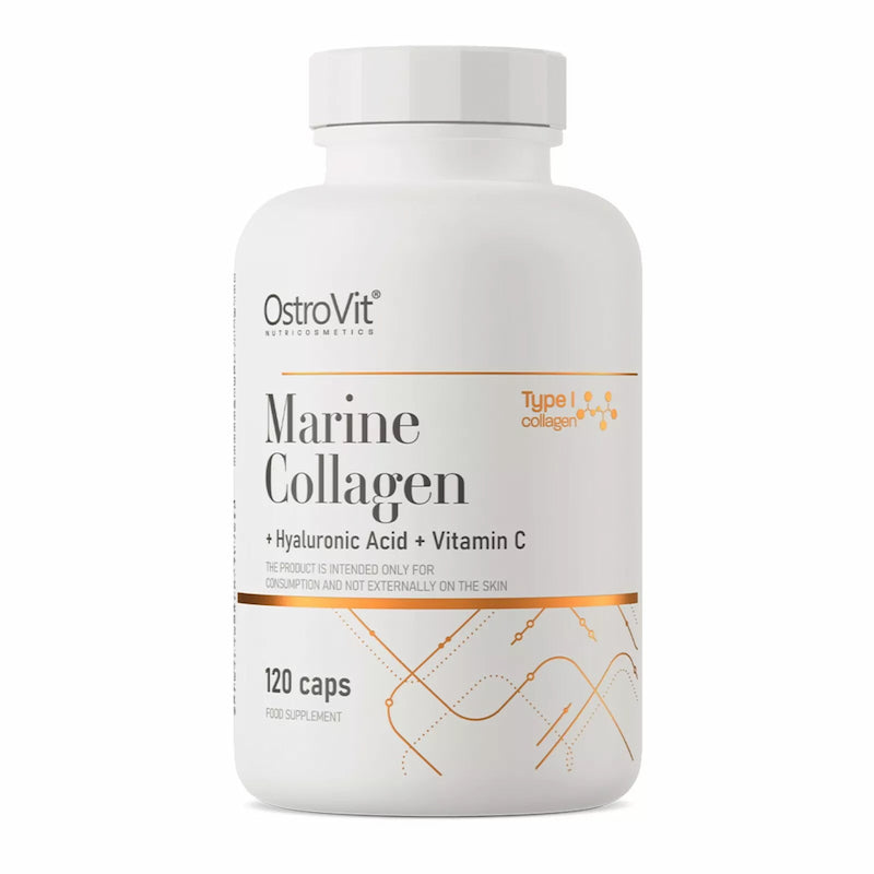 OstroVit Marine Collagen + Hyaluronic Acid + Vitamin C is a comprehensive dietary supplement that contains three valuable ingredients, such as marine collagen type I, hyaluronic acid and vitamin C. It is a preparation available in the form of easy-to-swallow capsules, which will be great for athletes, as well as people who care about a beautiful and healthy appearance.